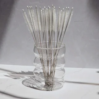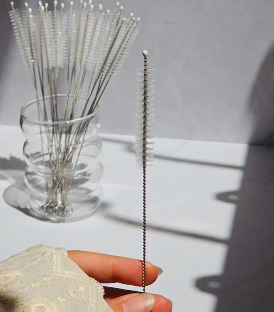 ساخته شده از جنس استیل مقاوم همراه با برسی زبر و متراکم با قطر حدود 5 میلیمتر و طول 19 سانتی متر بسیارمنعطف برای نی های صاف و خمیده دارای دسته انتهای سوراخ دار مناسب تمیز کردن نی، قاشق شربت خوری نی دار، لوله قوری و ...